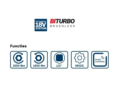 - BITURBO Brushless-technologie met een aanhaalmoment van 1000 Nm en een losbreekmoment van 1600 Nm